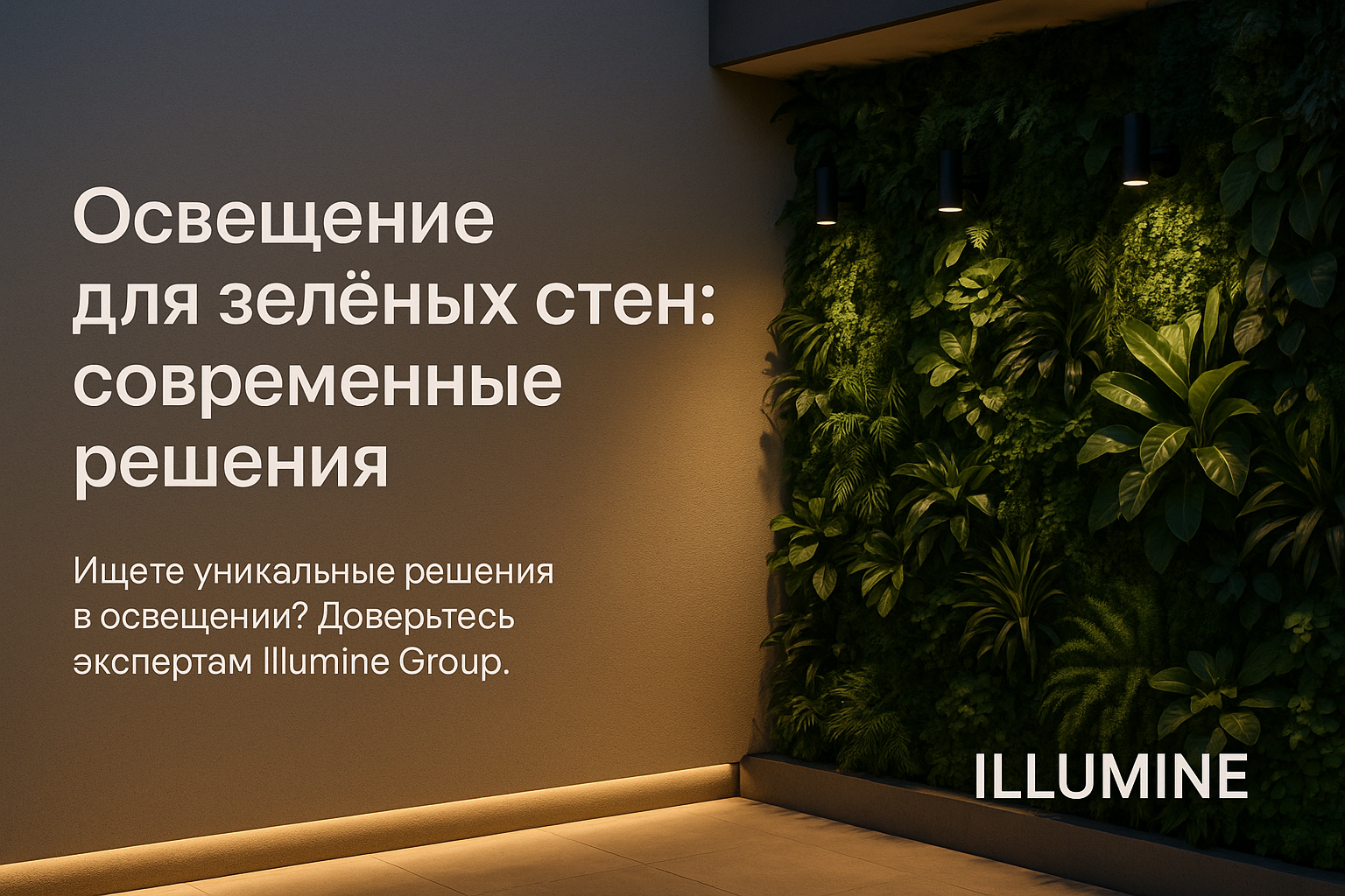 Линейное освещение: Используется для равномерного подсвечивания всей поверхности зелёной стены, создавая мягкий и рассеянный свет.