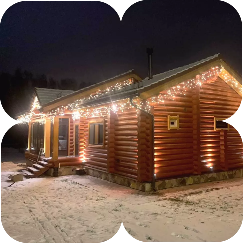 Заказчик обратился с просьбой создать сказочную новогоднюю атмосферу для своей семьи, украсив красавицу голубую ель перед домом, гостевой домик, в котором много проводит времени маленькая принцесса лет 6 со своей бабушкой, и дорожку, ведущую к этому гостевому домику.