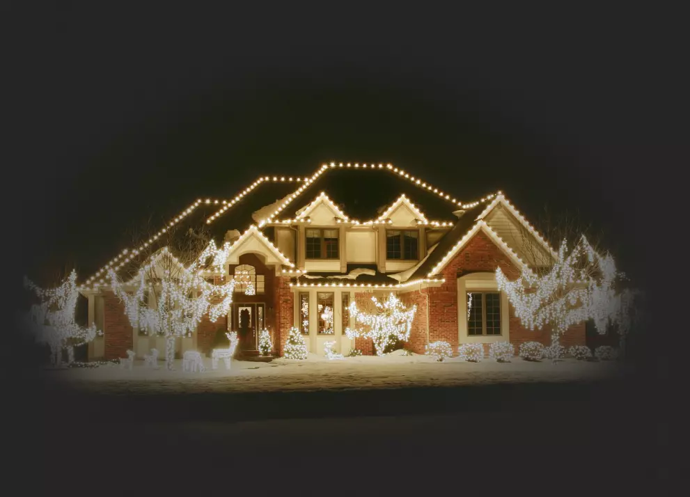 Дом находится в молодом коттеджном посёлке на самом его краю. И чёрное фото – это так вокруг дома в вечернее и ночное время. Но решение есть- контурная подсветка неоном! Неон выполняет сразу несколько функций: во-первых, усиливает яркость бахромы, делая её более выразительной и праздничной, во-вторых, контурная подсветка неоном – отличный вариант для круглогодичной подсветки. Свет от неона мягкий, бархатисто – рассеянным шлейфом ложится вокруг дома не слепя глаза и в-третьих, сама линия неона имеет размер всего 8*16 мм, поэтому эстетично впишется даже когда нет возможности сделать для неё нишу, при этом эффект освещения от неё на несколько метров вокруг!
